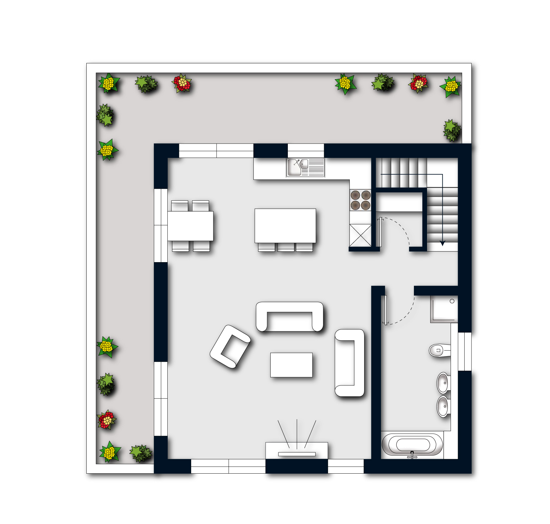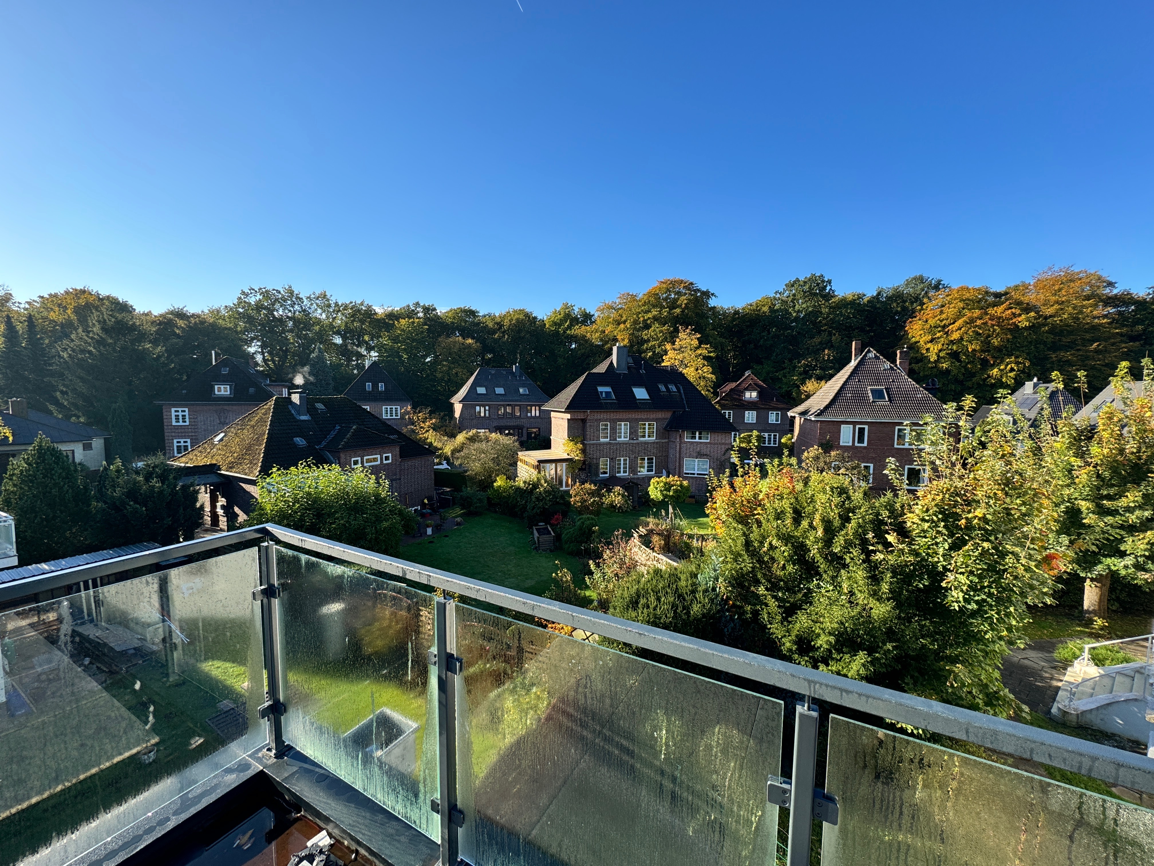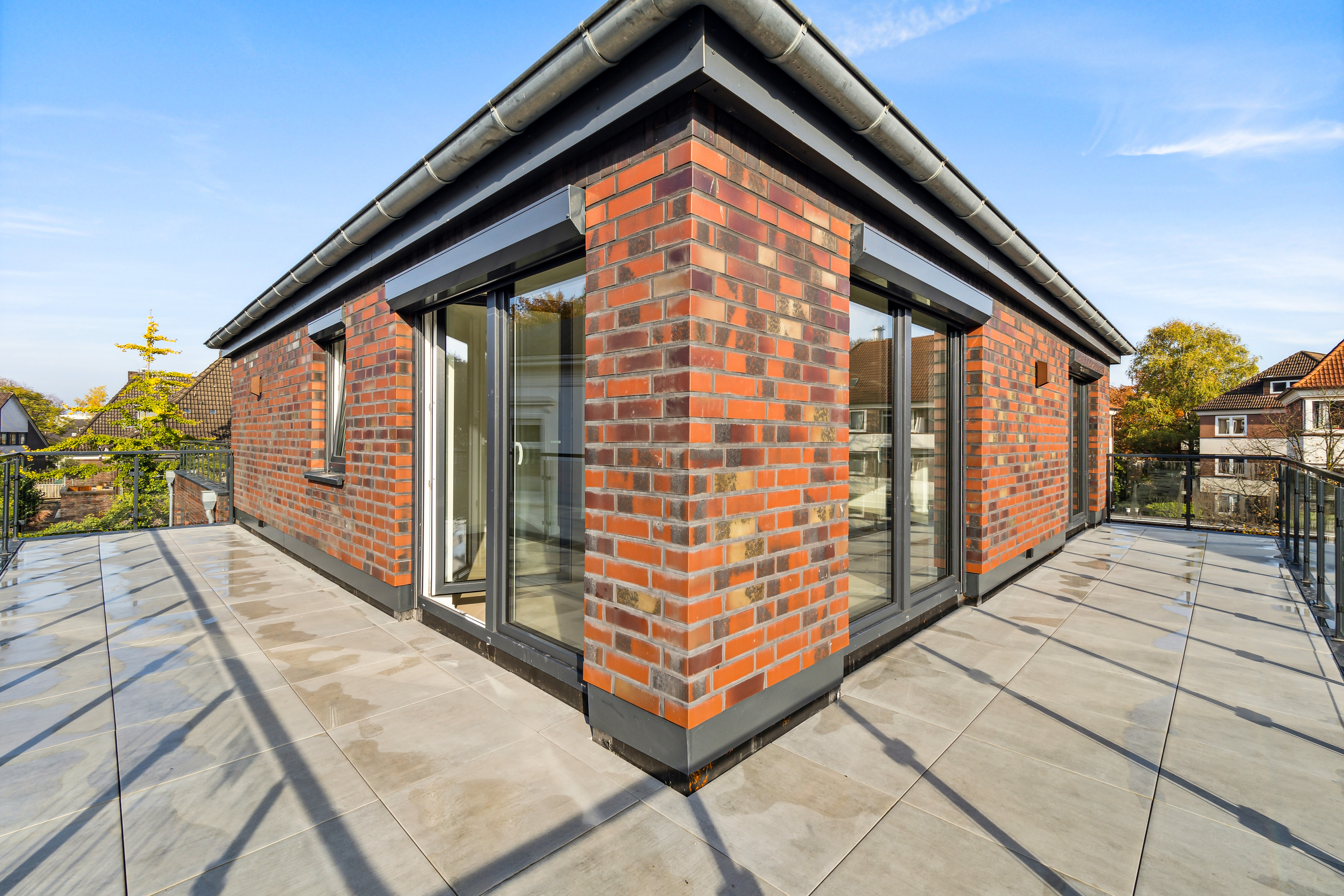 Von hier aus gelangen Sie auf die großzügige, L-förmige Süd-/West-Dachterrasse mit Außensteckdosen und Beleuchtung – ideal für sonnige Nachmittage und entspannte Abende mit Blick ins Grüne.