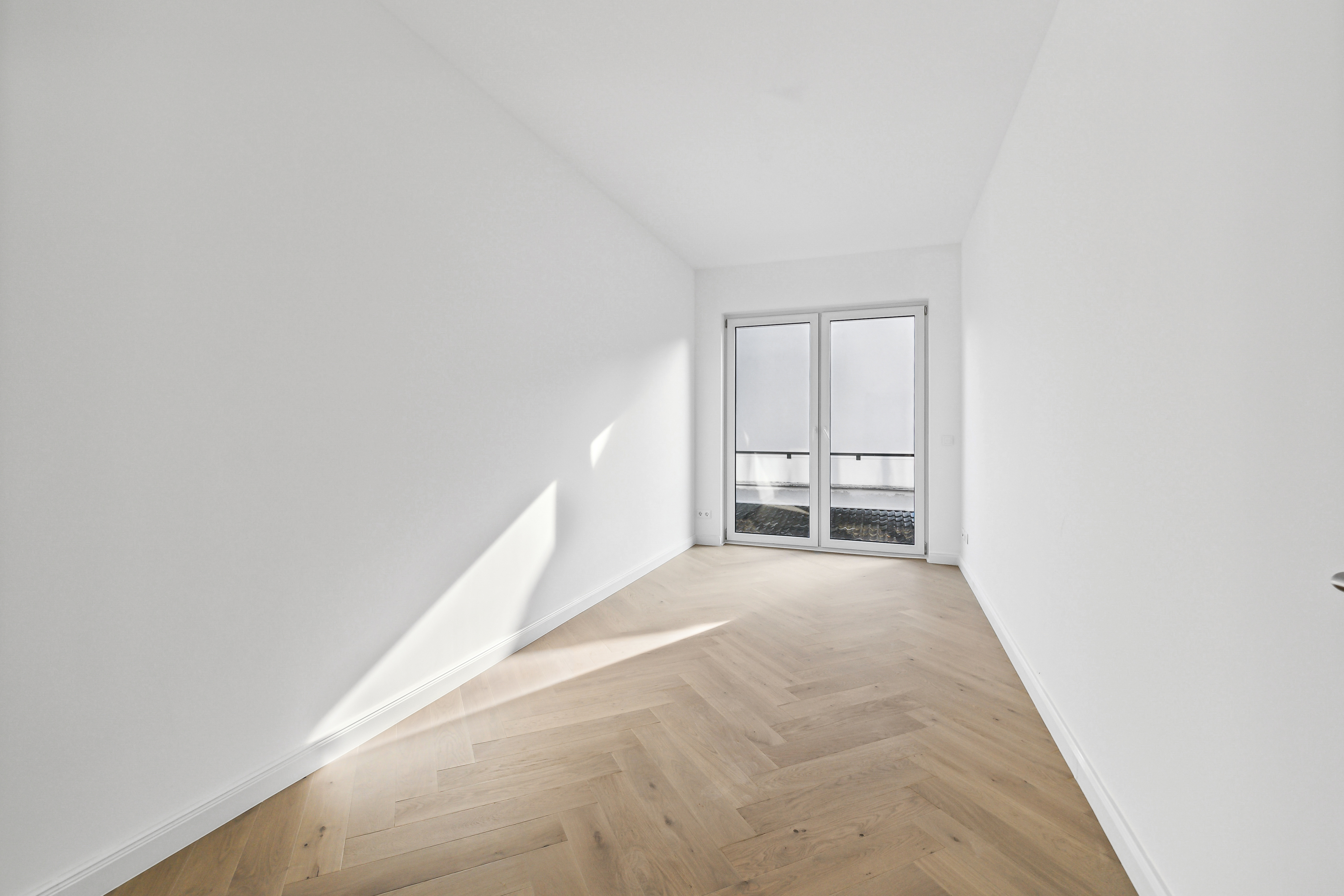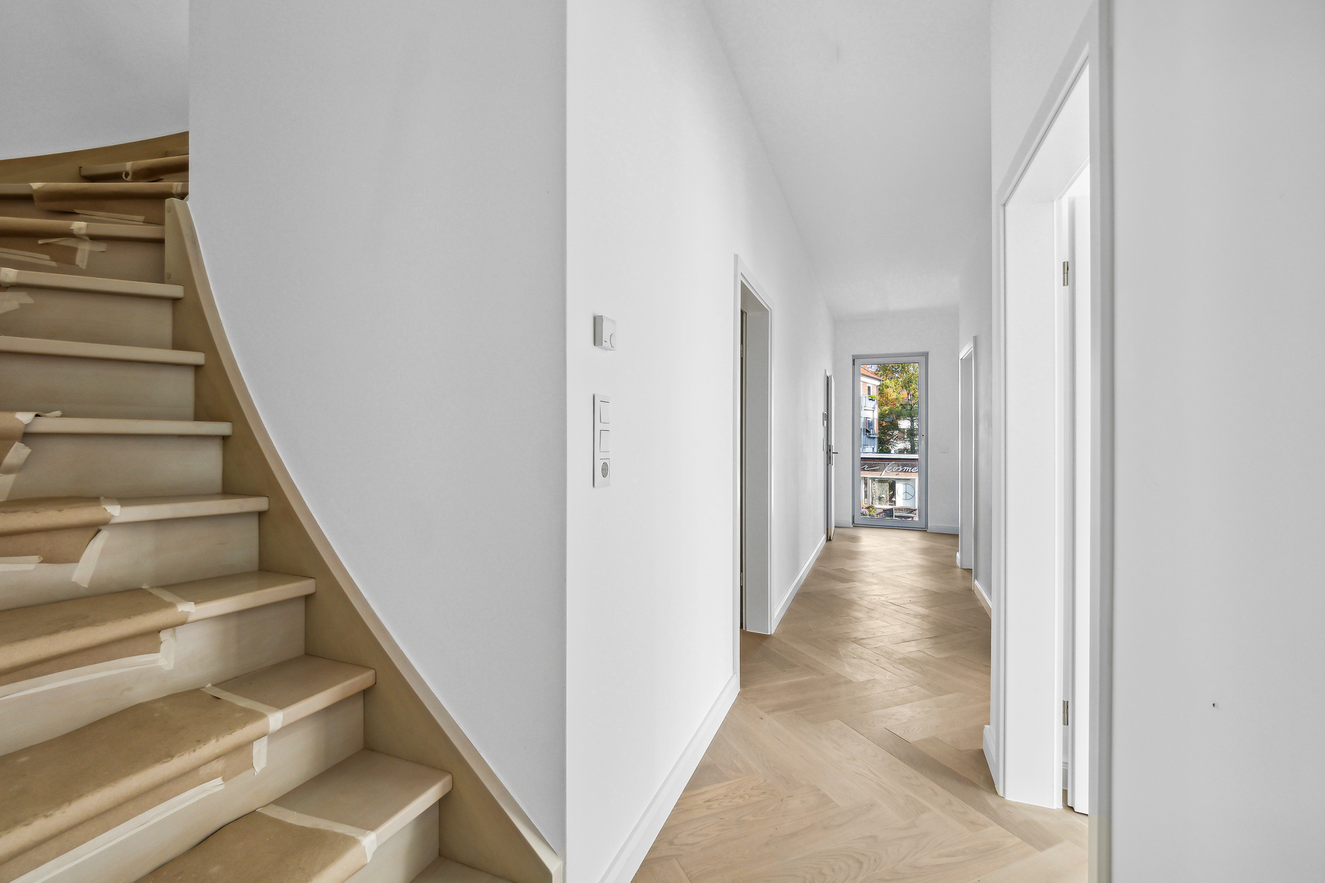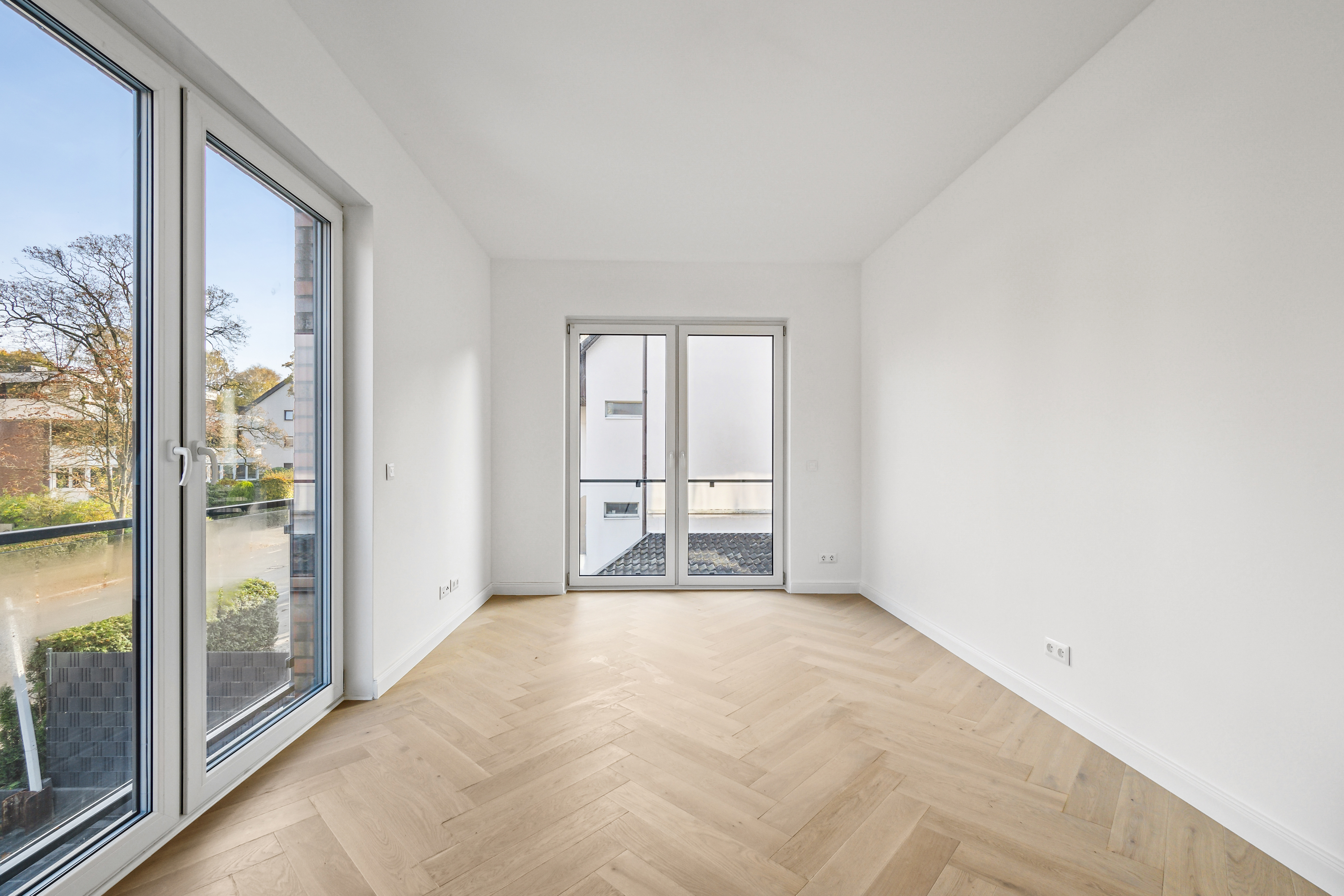 Das weiß gekalkte Fischgrätparkett aus Eiche verleiht der modernen Ausstattung eine klassische, hochwertige Note. Eine Fußbodenheizung mit raumweiser Steuerung sorgt in allen Bereichen für angenehmen Wohnkomfort.