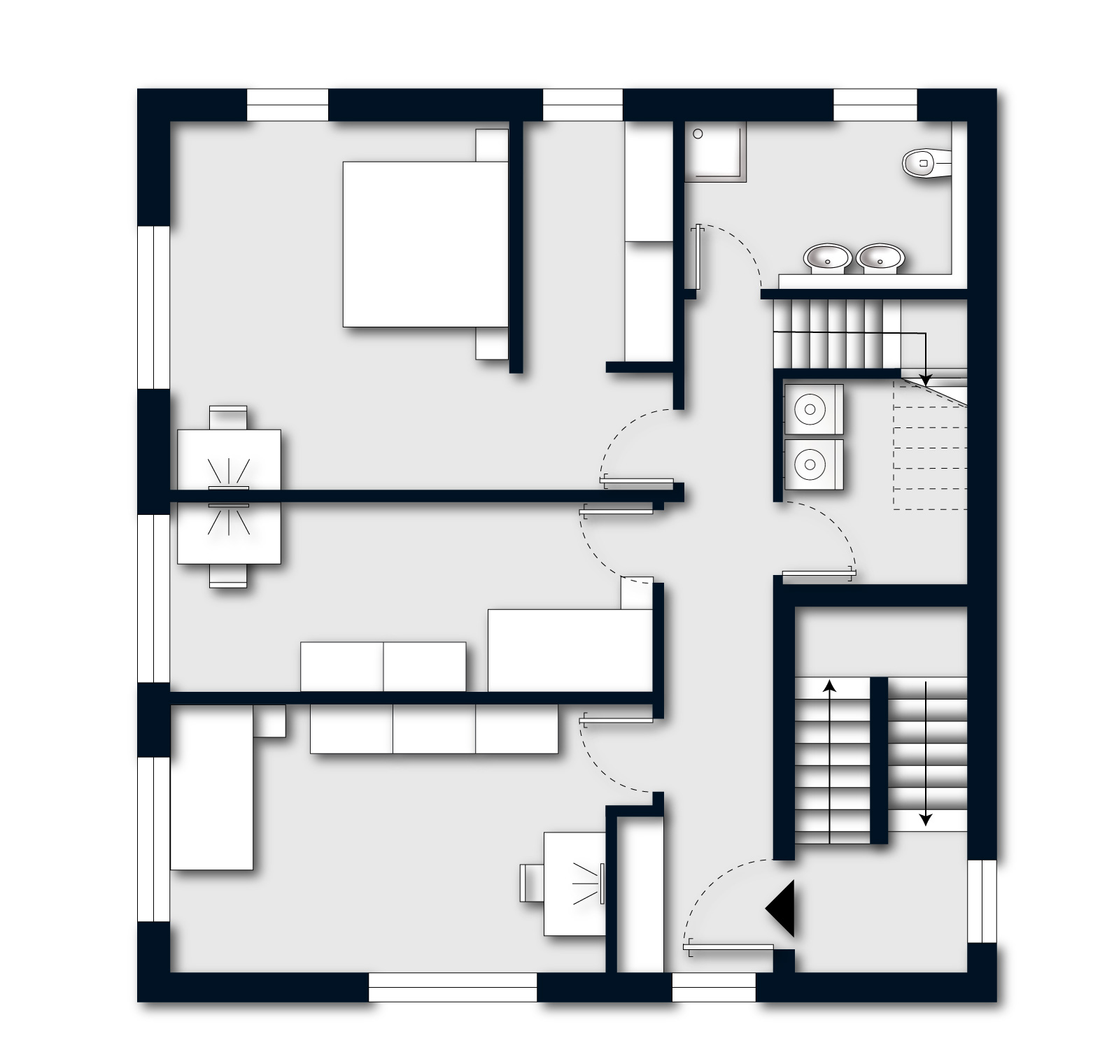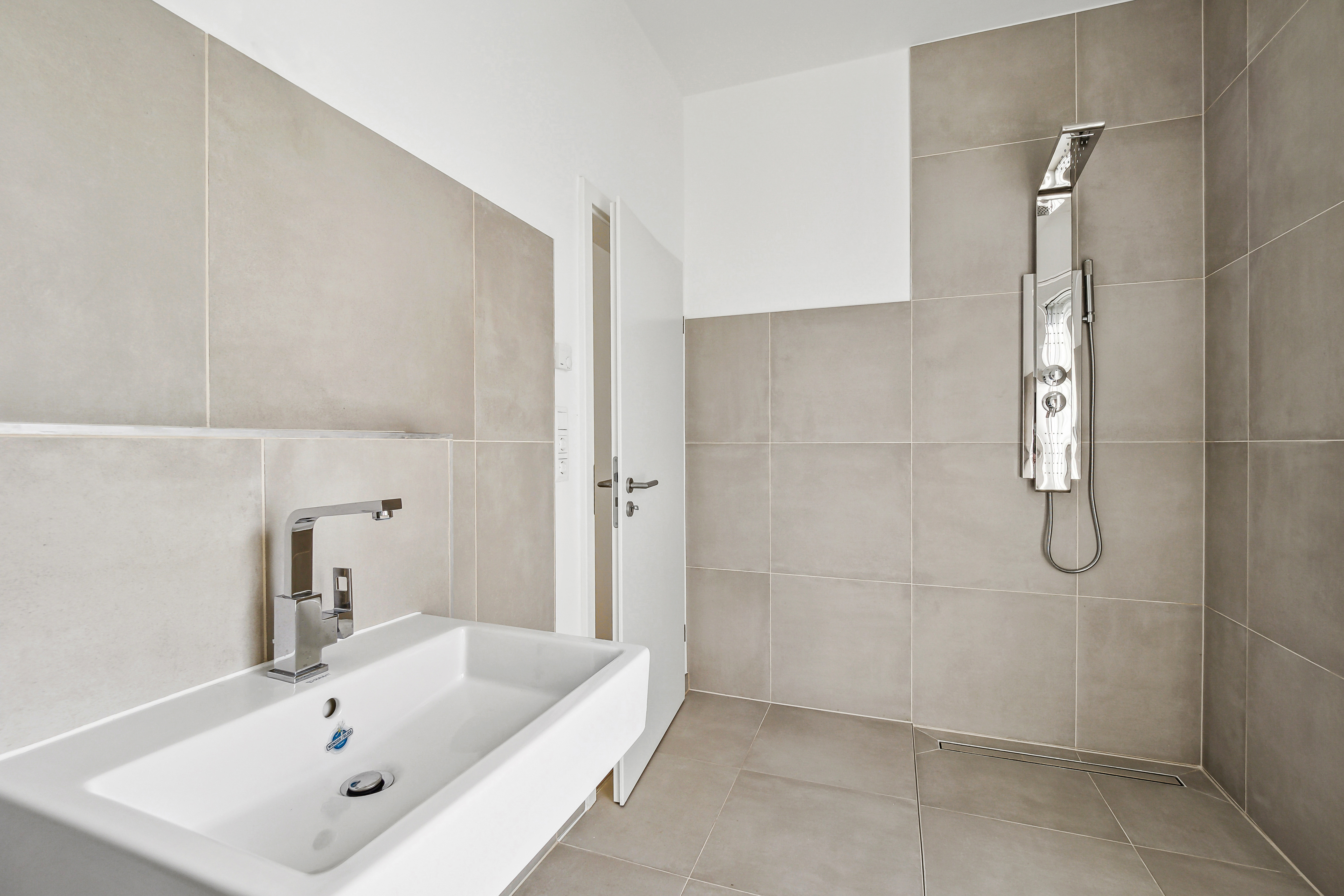 Im 1. Obergeschoss befindet sich der private Schlafbereich mit drei gut geschnittenen Zimmern – eines davon mit separatem Ankleideraum – sowie einem stilvollen Vollbad. Dieses ist mit großformatigen grauen Fliesen (60 x 60 cm), weißen Sanitärobjekten von Duravit und Villeroy & Boch sowie Armaturen von Grohe ausgestattet.