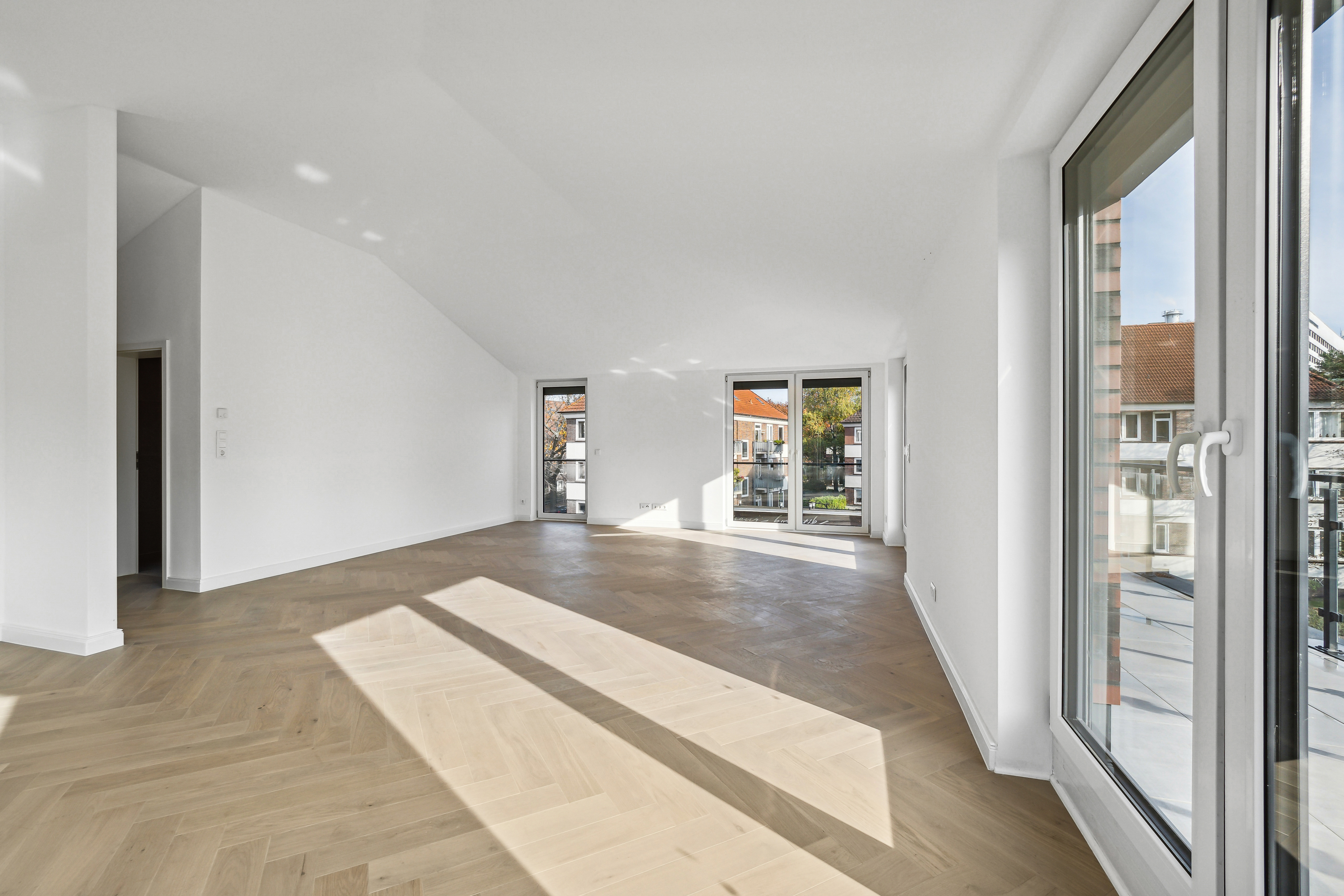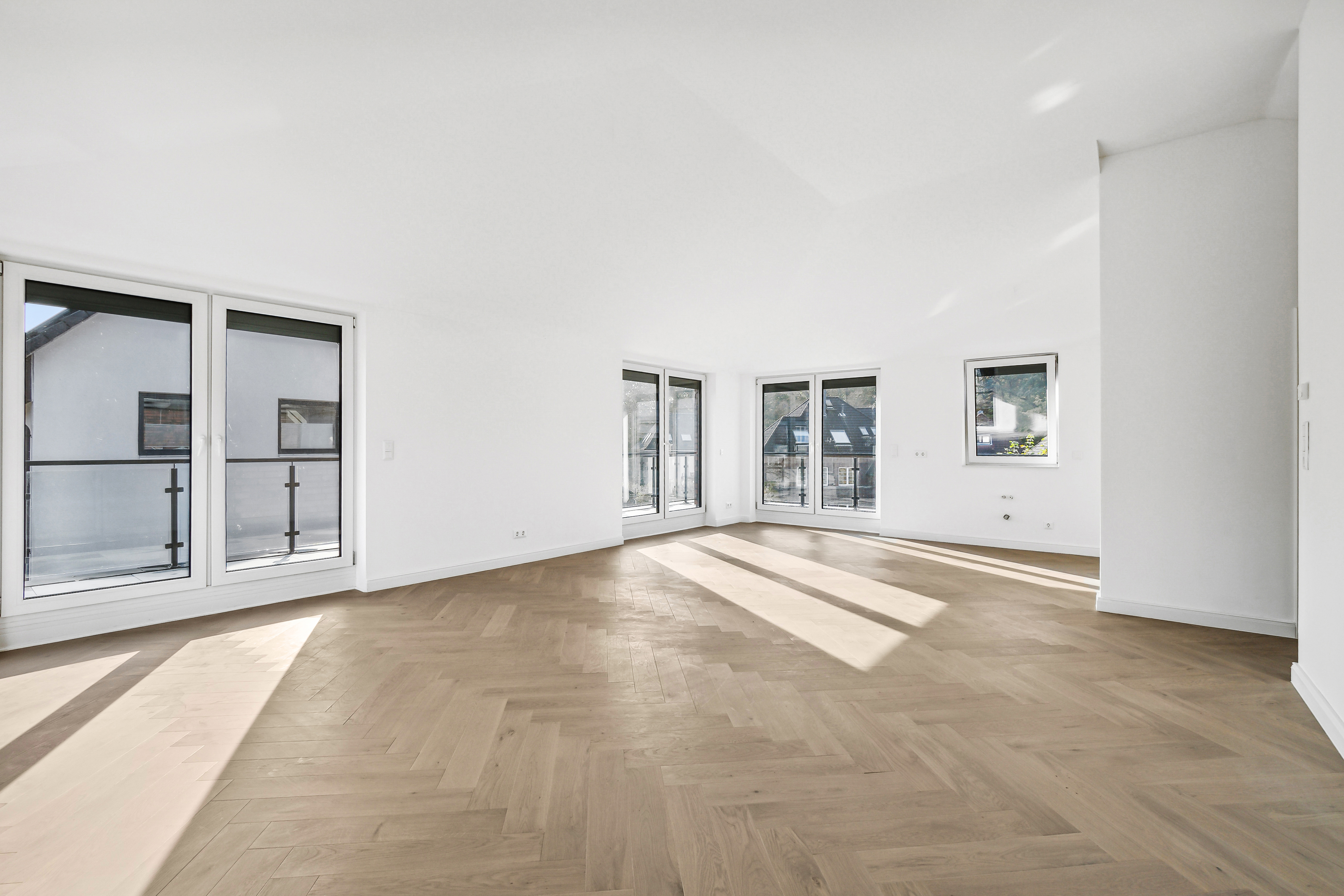 Im Dachgeschoss angekommen, erwartet Sie ein beeindruckender Wohn- und Essbereich mit Deckenhöhen von bis zu ca. 3,50 m. Die zahlreichen bodentiefen, dreifachverglasten Fenster sorgen für ein außergewöhnlich lichtdurchflutetes Ambiente. Elektrische Außenrollläden bieten bei Bedarf komfortable Verdunkelung.