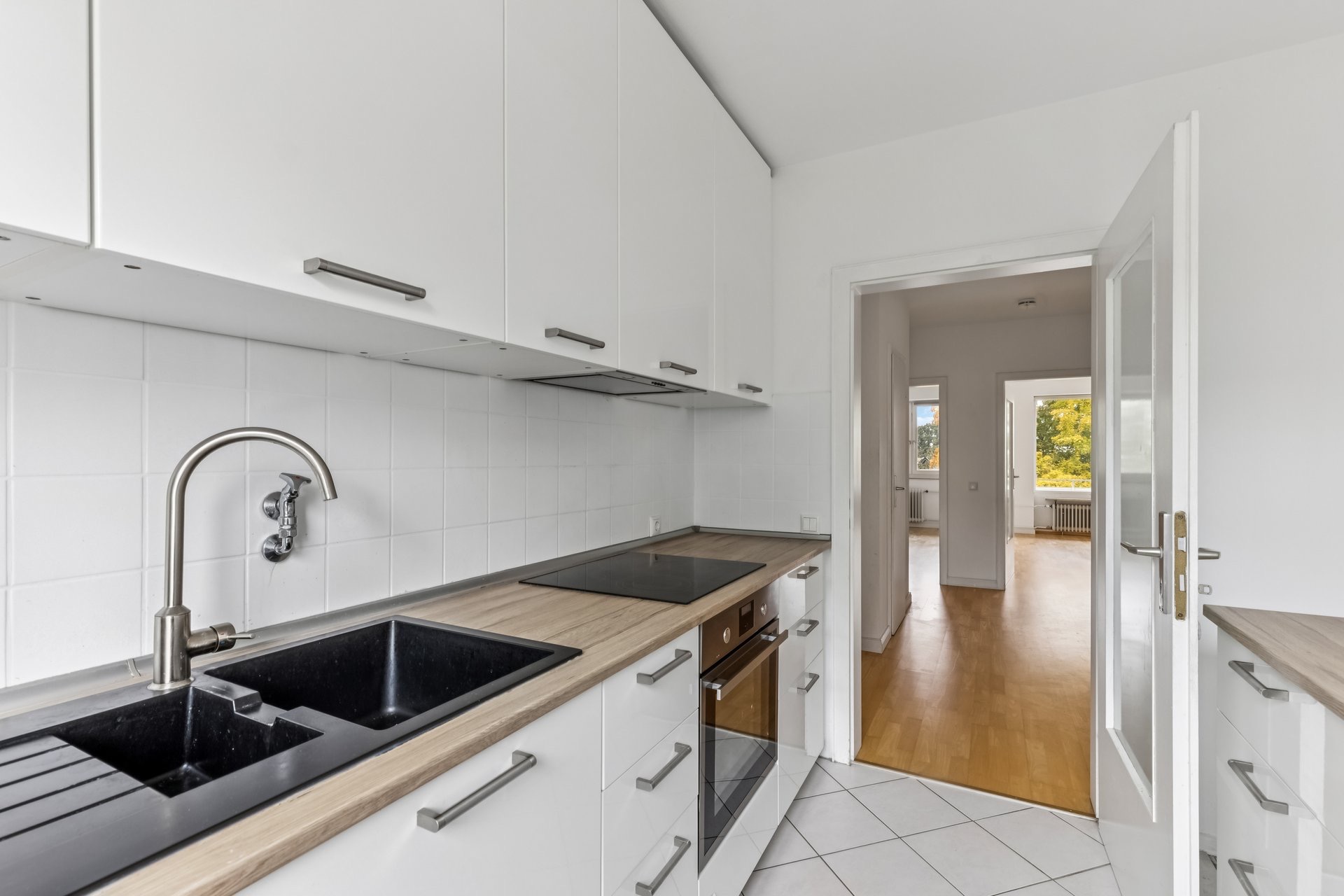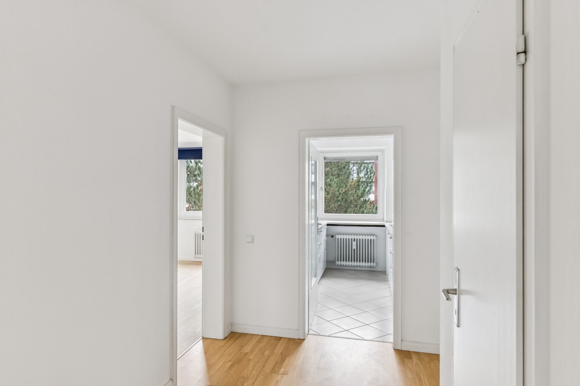 Die Wohnung ist weiß gestrichen, mit Laminatfußboden in den Wohnräumen ausgestattet und