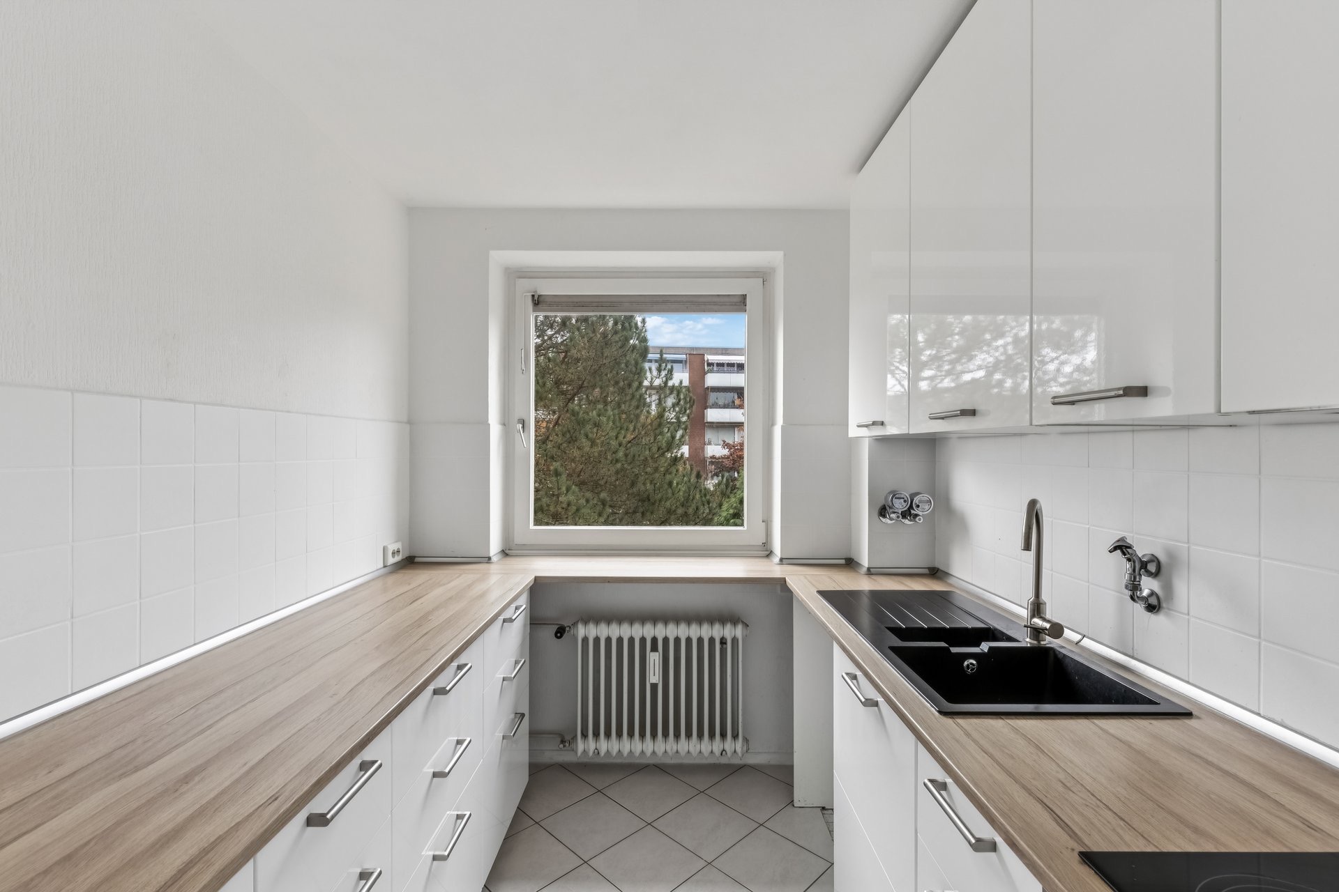 • Eine helle Einbauküche (gefließt)