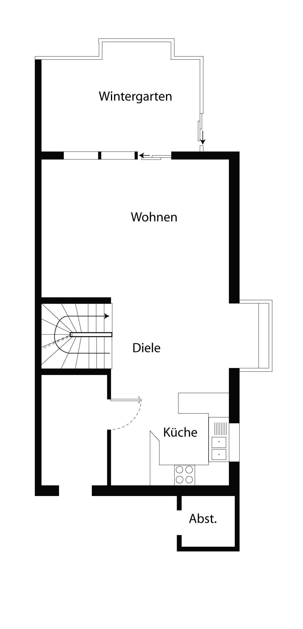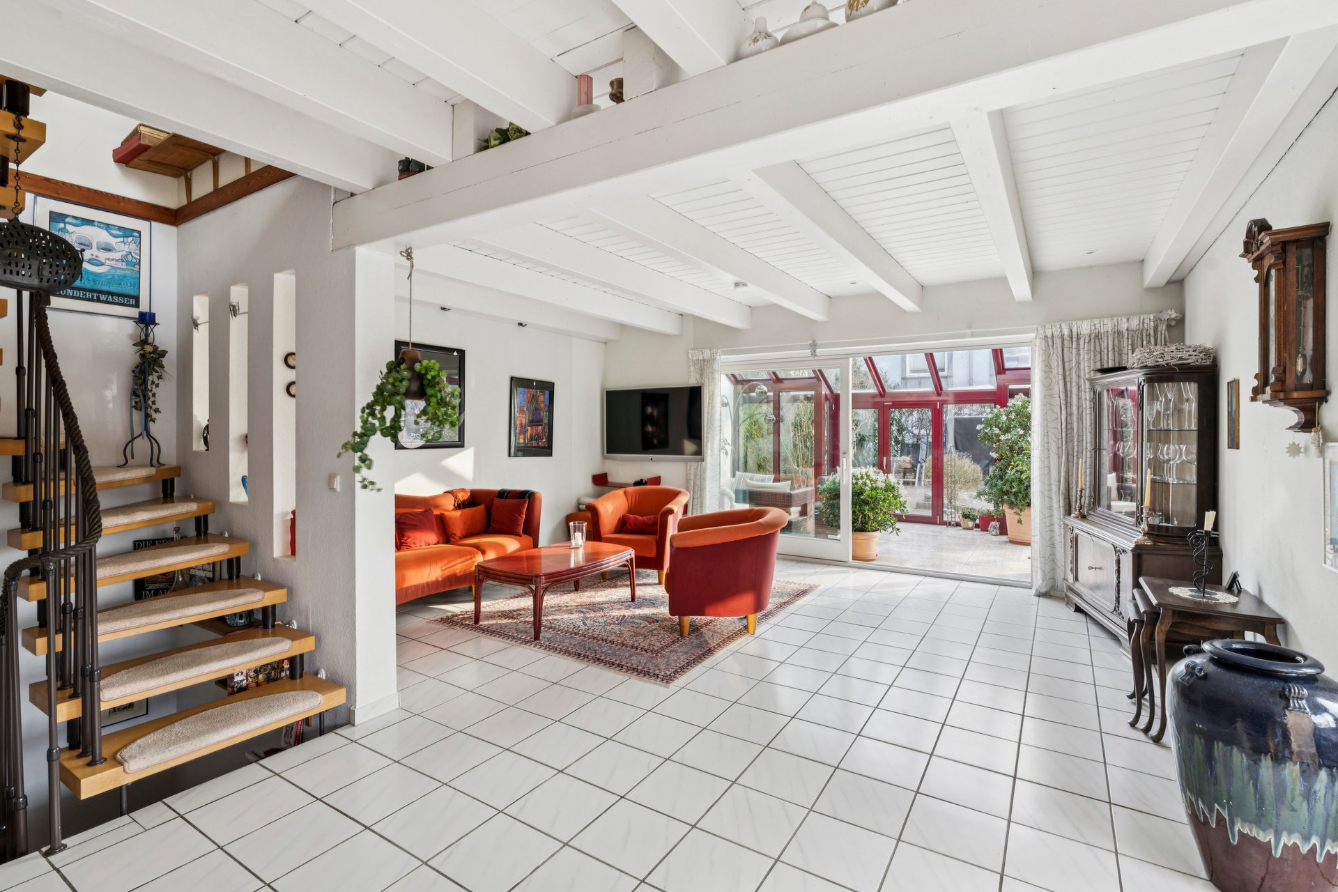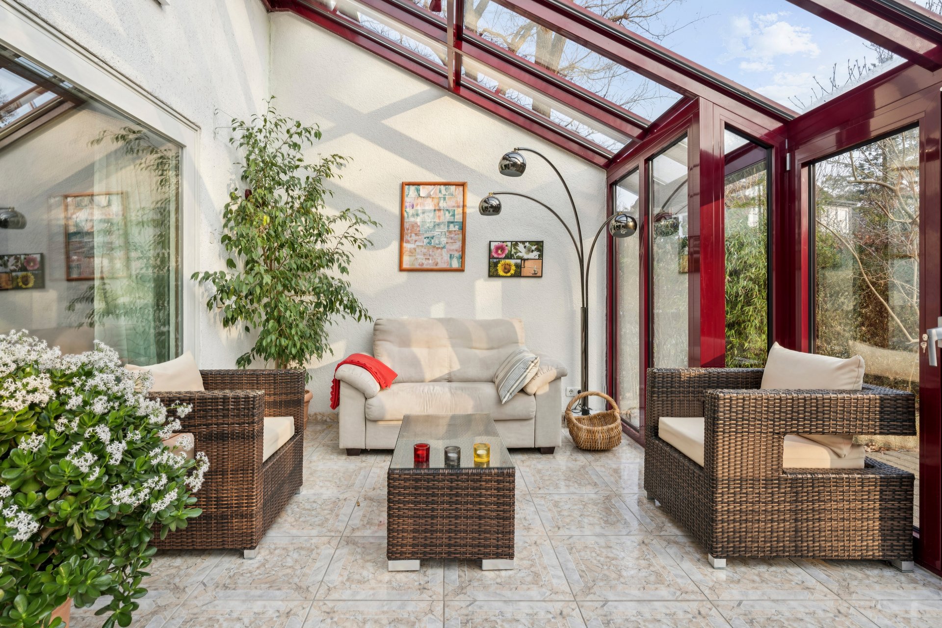 das helle Wohnzimmer, von dem aus der Zugang zum lichtdurchfluteten Wintergarten besteht.