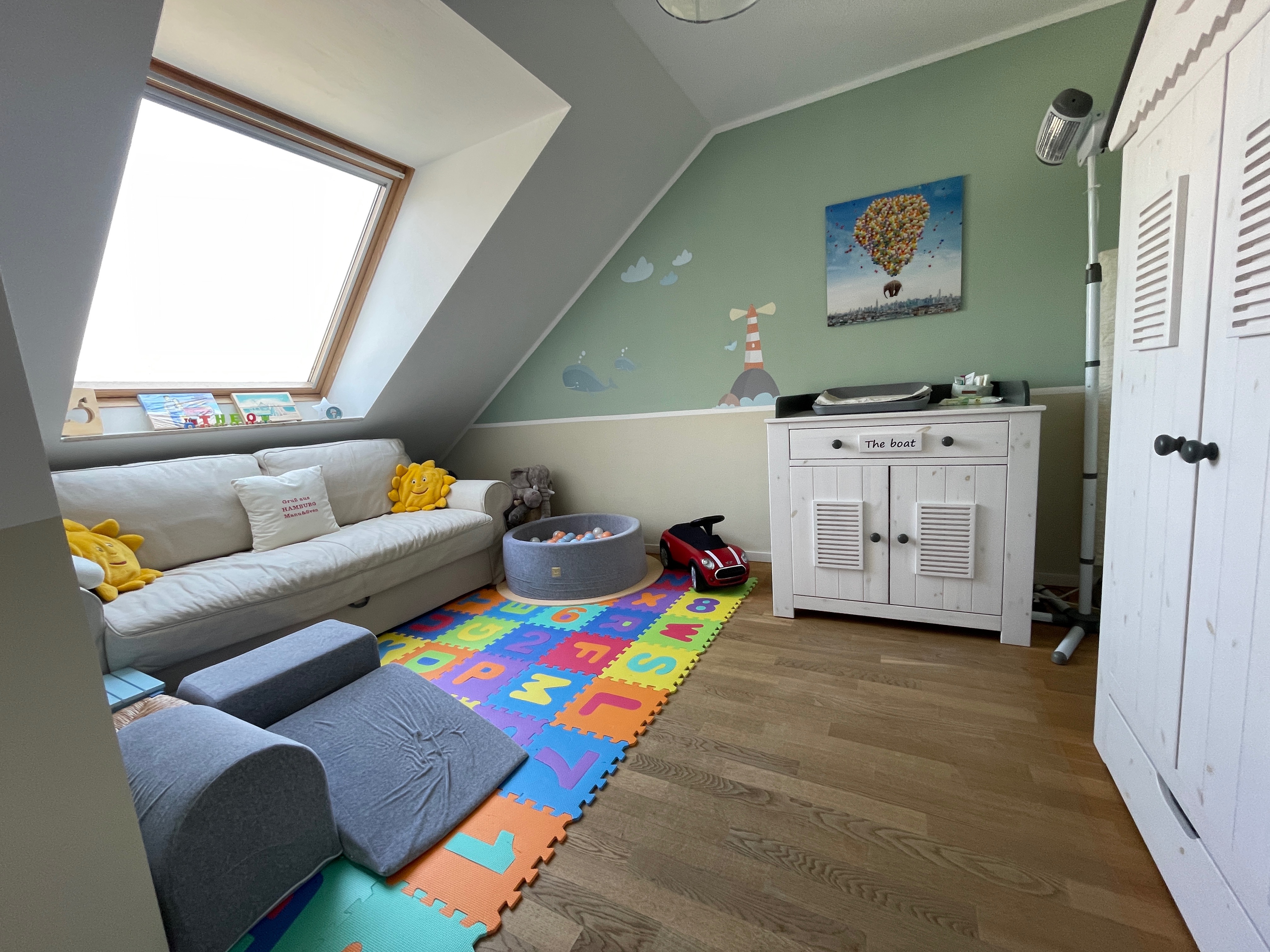 Das Dachgeschoss bietet ein weiteres großzügiges Zimmer, das sich ideal als Schlaf-, Arbeits- oder Hobbybereich eignet.