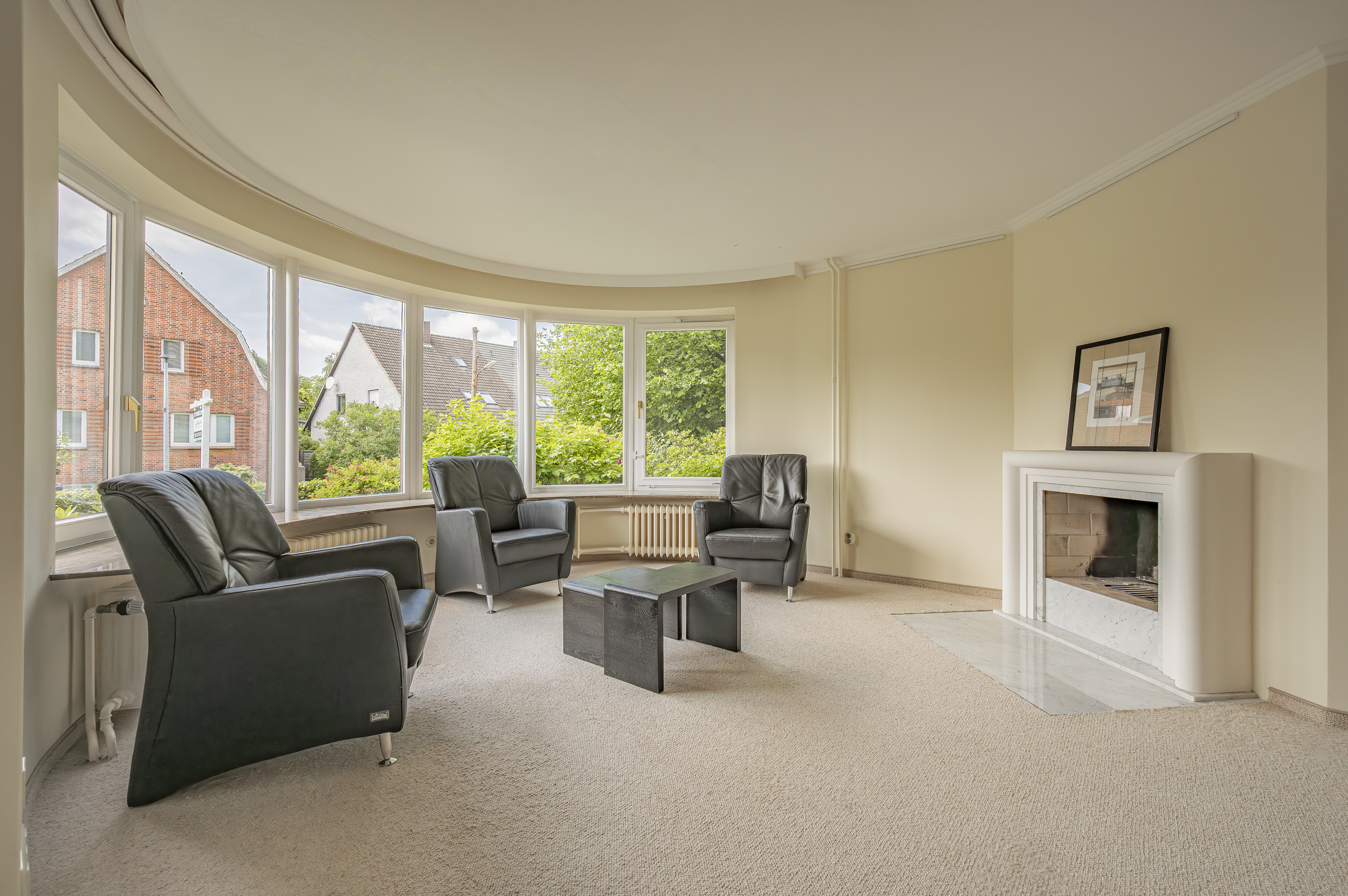und einem besonders schönen rundgestalteten Erker um den vorhandenen Kamin. An den