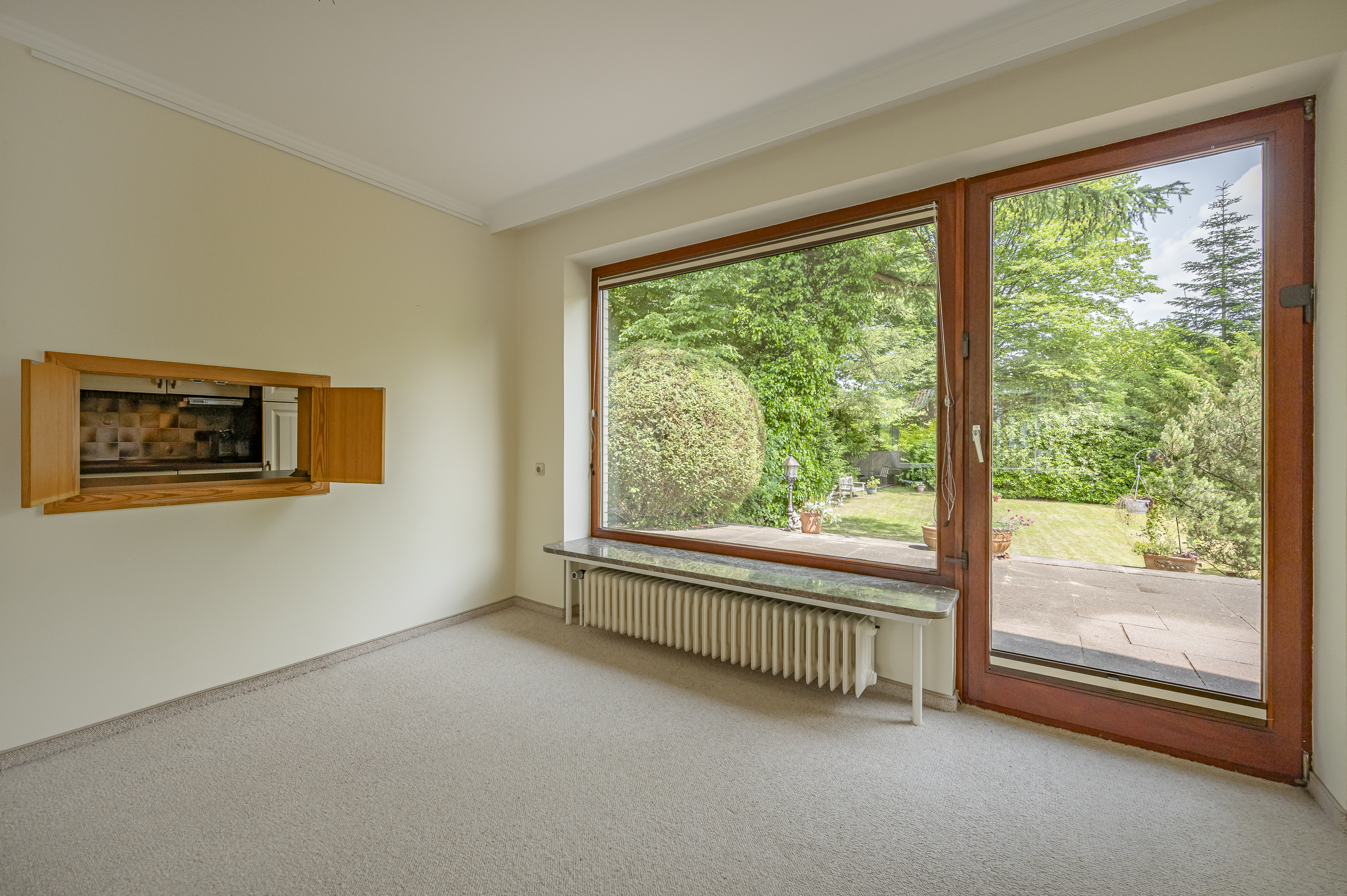 werden kann. Die vorhandene Küche verfügt über Einbauten und eine integrierte Durchreiche