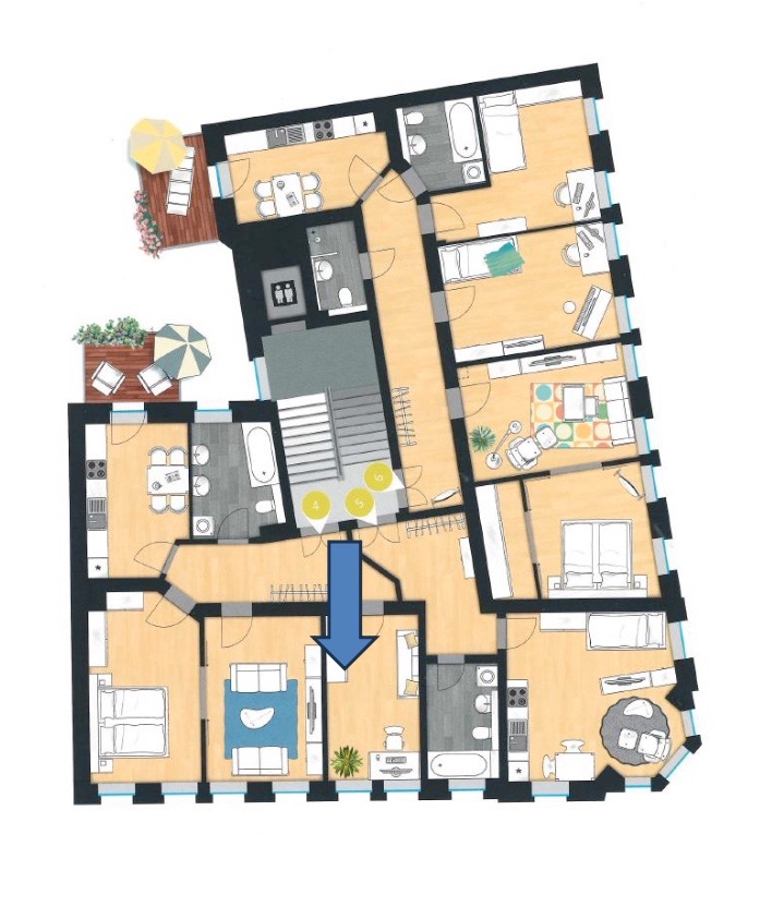 Obergeschoss in einem historischen und stuckverzierten Eckgebäude mit Turm aus dem